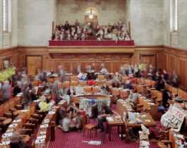 Bereits mit seiner Arbeit _We English_ (2009) lieferte Simon Roberts ein Porträt seiner Nation. Die sich zu jener Zeit andeutende ökonomische Krise ist in _Let This Be a Sign_ nicht mehr zu übersehen. Roberts, der 2010 vom House of Commons beauftragt wurde, die Wahl zu dokumentieren, konzentriert sich in dieser Serie auf die Auswirkungen der sozialen Veränderungen in Großbritannien. Er trägt die visuellen Zeichen und Anzeichen zusammen, die auf die im öffentlichen Raum nur vereinzelt sichtbare Rezession hindeuten, auf die verborgene Armut der Mittelklasse, den wachsenden Unmut in der Gesellschaft. Durch die Konzentration auf die Ikonografie dieser Entwicklungen und die Verbindung seiner Fotografien mit Texten, Videos und Objekten, konstruiert Roberts eine Fiktion, die zugleich die Vielfalt der gegenwärtigen britischen Realität wiedergibt.